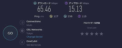 Surfsharkの今月の速度テストは、ダウンロードが65.46Mbps、アップロードが15.13Mbps、Ping値は117msでした。