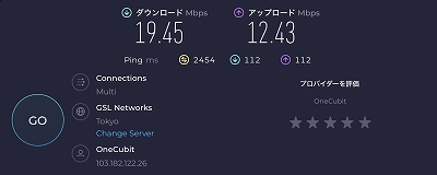 セカイVPNの今月の速度テストは、ダウンロードが19.45Mbps、アップロードが12.43Mbps、Ping値は2454msでした。