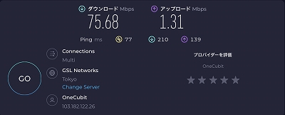 かべねこVPNの今月の速度テスト結果は、ダウンロードが75.68Mbps、アップロードが1.31Mbps、Ping値は77msでした。