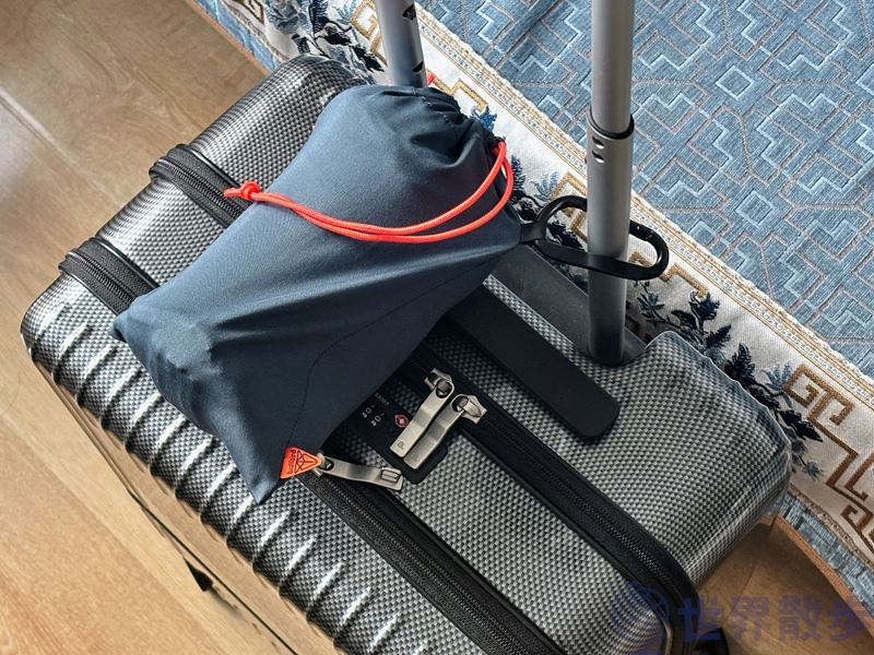 また、付属の袋もおしゃれかつ使いやすく、カラビナが付いているのでリュックのハンドルに取り付けたり、スーツケースのハンドルに取り付けられます。